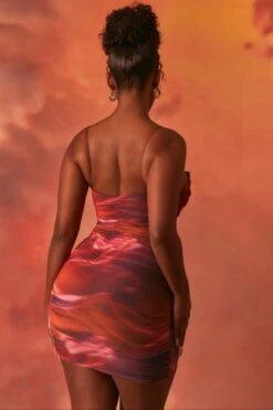 Lunar Sleeveless Bodycon Ruched Mesh Mini Dress In Orange