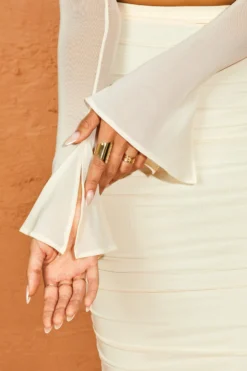 Belina will be the top you wear all summer long, a cropped design with sheer mesh sleeves that flare at the wrists. With asymmetric styling and cut out features, the design is complete with a cowl neckline and ruched detailing. Wear yours with the Mya skirt, platforms and loose waves.