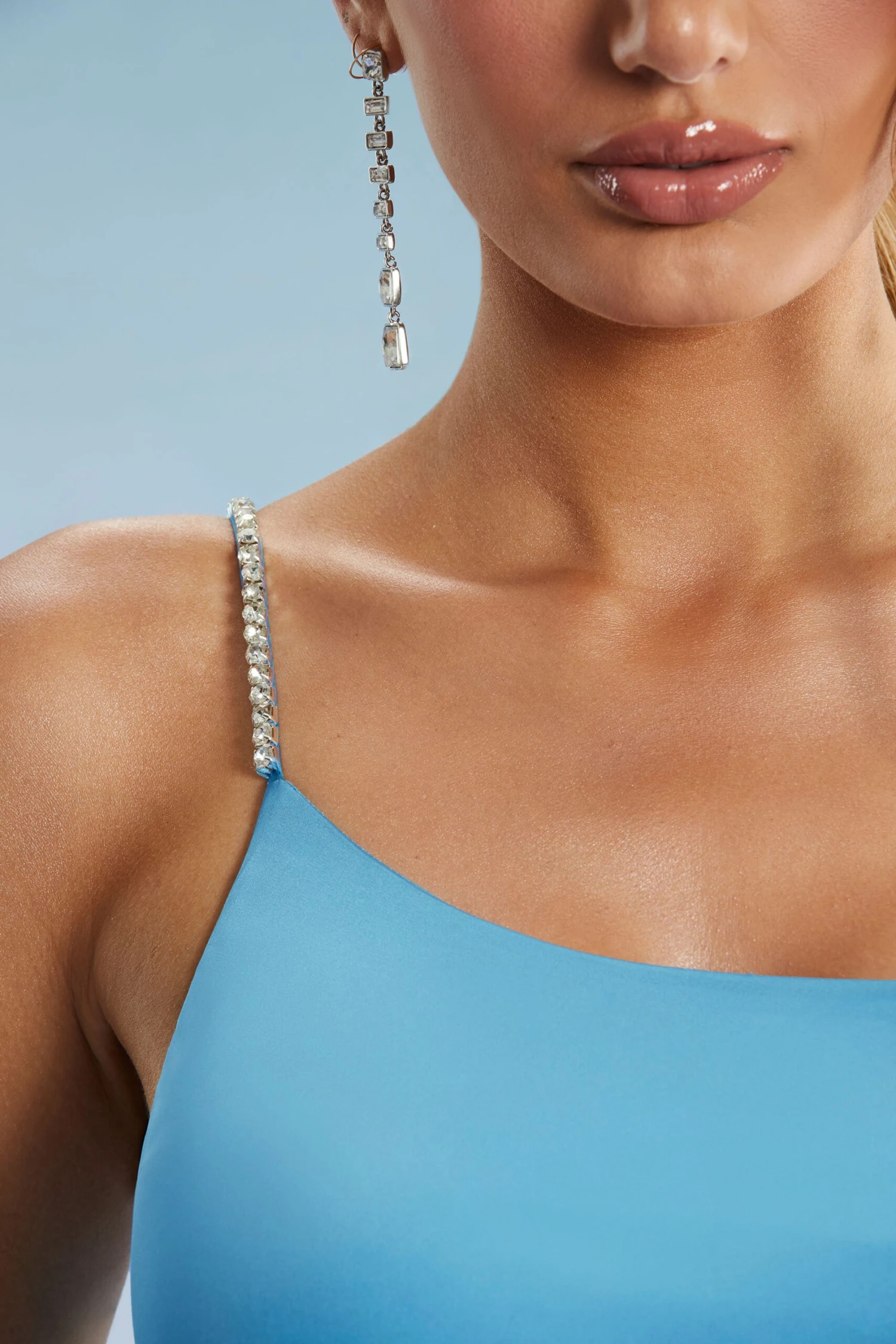Decadent, premium and luxurious. The Behati satin maxi dress features an embellished crystal shoulder strap, an asymmetric neckline and an adjustable cut-out at the waist. The seductive thigh-split starts at the hip and runs along the length of the dress.