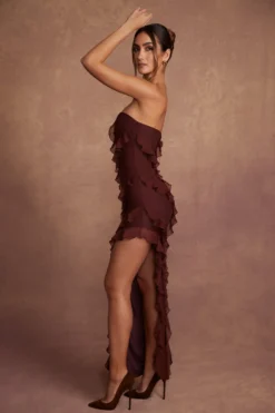 Taking inspiration from Italian love stories, Nevali is the stand out style in the Fiorella collection. Designed in our premium, dual layered mesh that’s soft against the skin and smooths your silhouette, Nevali features a bandeau neckline that exposes your decolletage. Cut to a maxi length with an asymmetric hemline, Nevali is adorned with romantic ruffle detailing throughout the design ensuring that standing out won’t be a problem. Dramatic ruffling, a maxi length and statement colourways ensure that Nevali will be your go-to style for effortlessly glamorous evening wear.