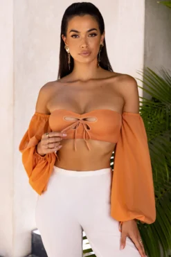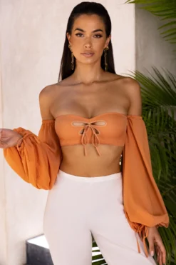 We know you’ve got a case of wanderlust, honey. That’s why we’re bringing you our new crop top – perfect to add to your wardrobe this season. The off-shoulder cut and sheer flowing balloon sleeves with cuff ties create a romantic, playful ‘fit. Designed with delicate floral inspired cut-out detailing over the bust, this look calls for simple styling and days spent exploring in the sun!