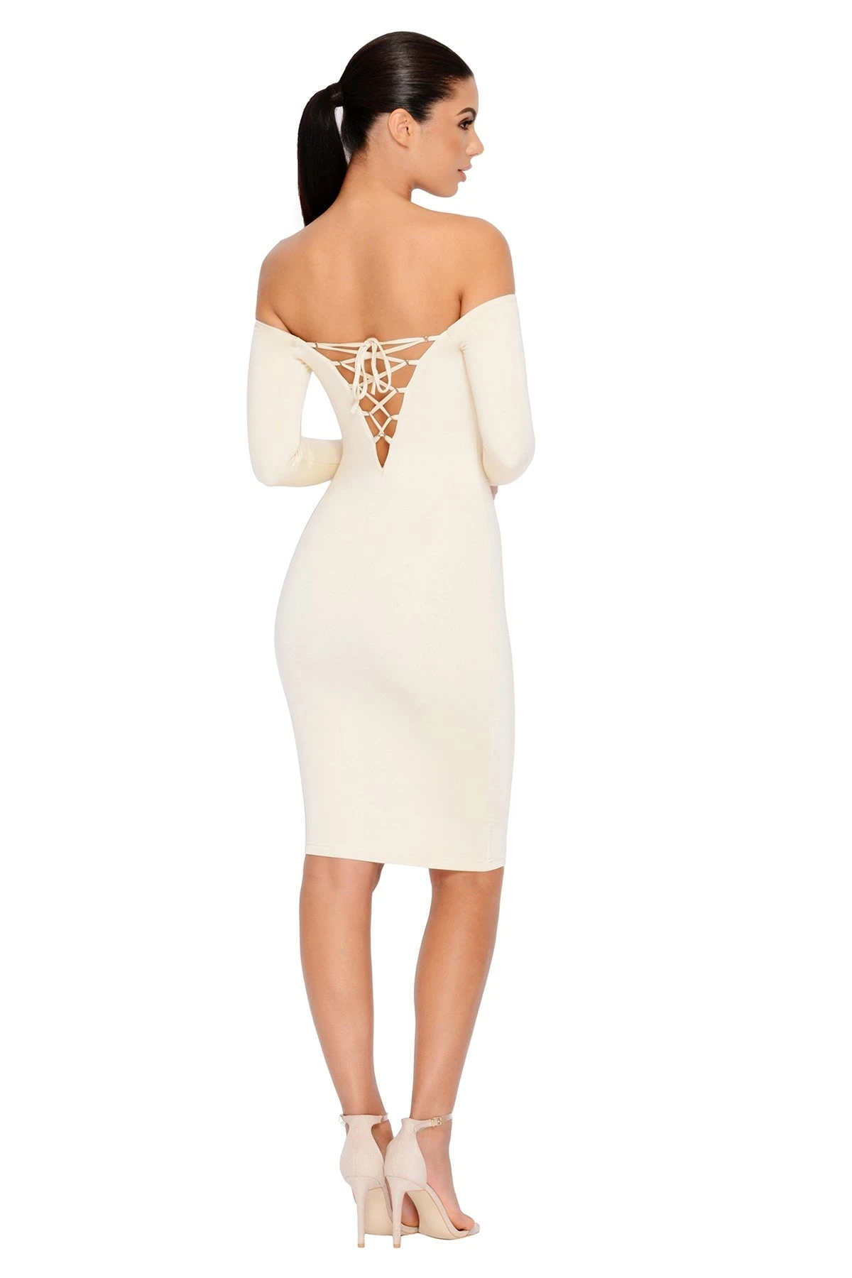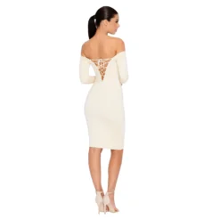 Stay sleek with our super soft double-layered fabric, designed to give the figure a smooth and sculpted appearance. Bare Enough is a midi length dress with an off-the-shoulder Bardot style and long sleeves.