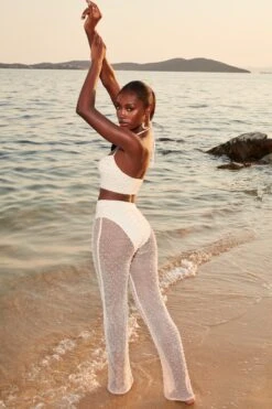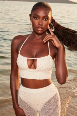 WeÂ’re totally here for our latest crop top, babe. With pearl bead embellishments and a keyhole cut-out front, our crochet halter neck top is complete with an ultra-thin tie fastening for a delicate finish. Style with the matching embellished knit trousers for a dreamy crochet co-ord. Summer stylinÂ’ just got even hotter, honey.