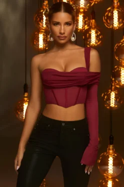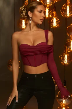 With figure enhancing corsetry delicately enveloped in a soft mesh overlay for the ultimate figure defining fit, Aurora is the crop top your wardrobe has been calling for. Featuring a graceful one shoulder design that falls into a gentle flared sleeve, Aurora encompasses feminine elegance. For romantic styling, pair with faux leather trousers and high heels.
