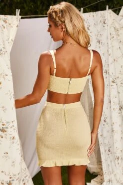 Styled for Summer nights, our figure-hugging mini skirt is designed in stretchy, crinkle fabric for a flattering fit. With a sweet frill hem and contrasting satin waistband, our matching mini top will complete the set, proving it takes two to tango, babe.