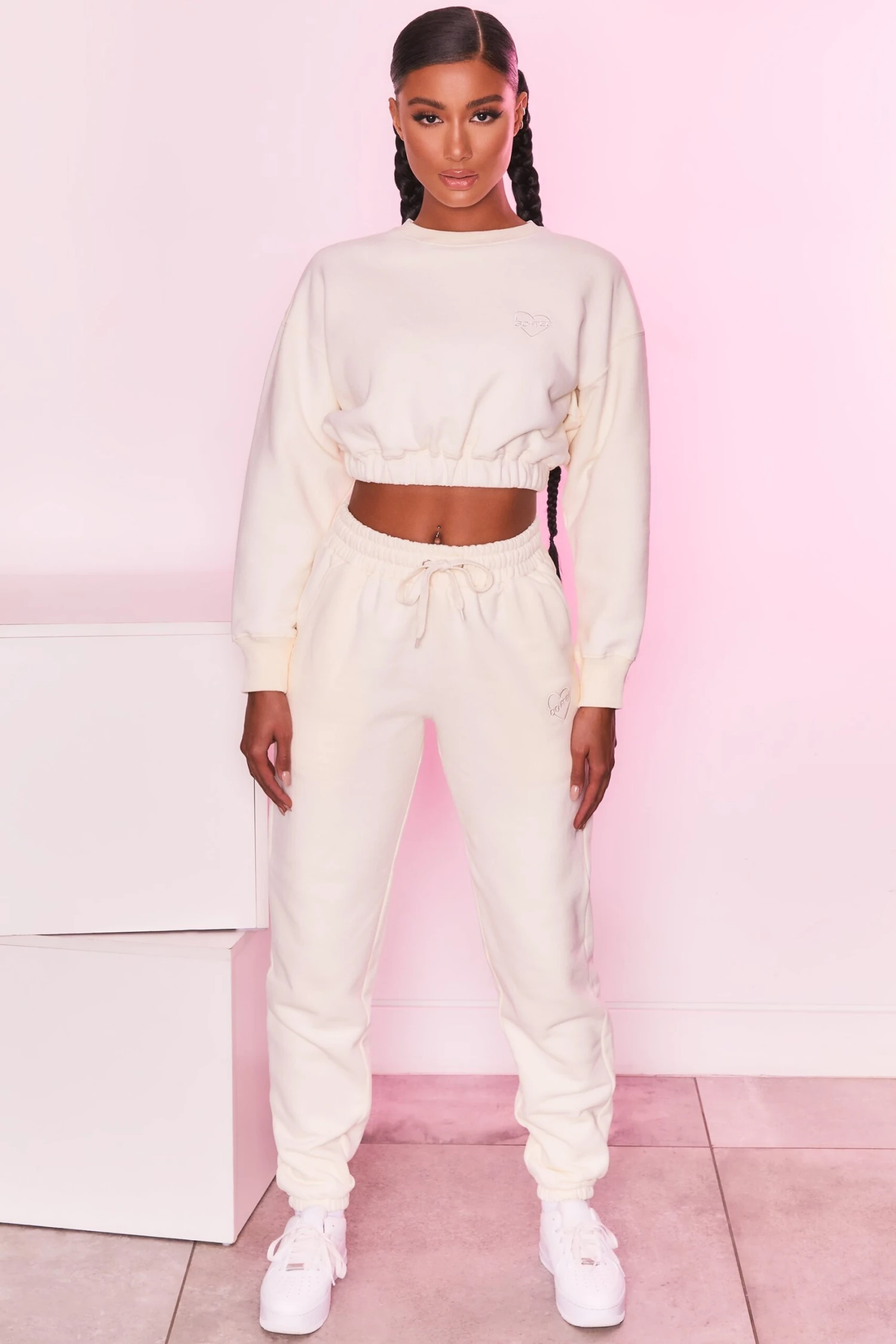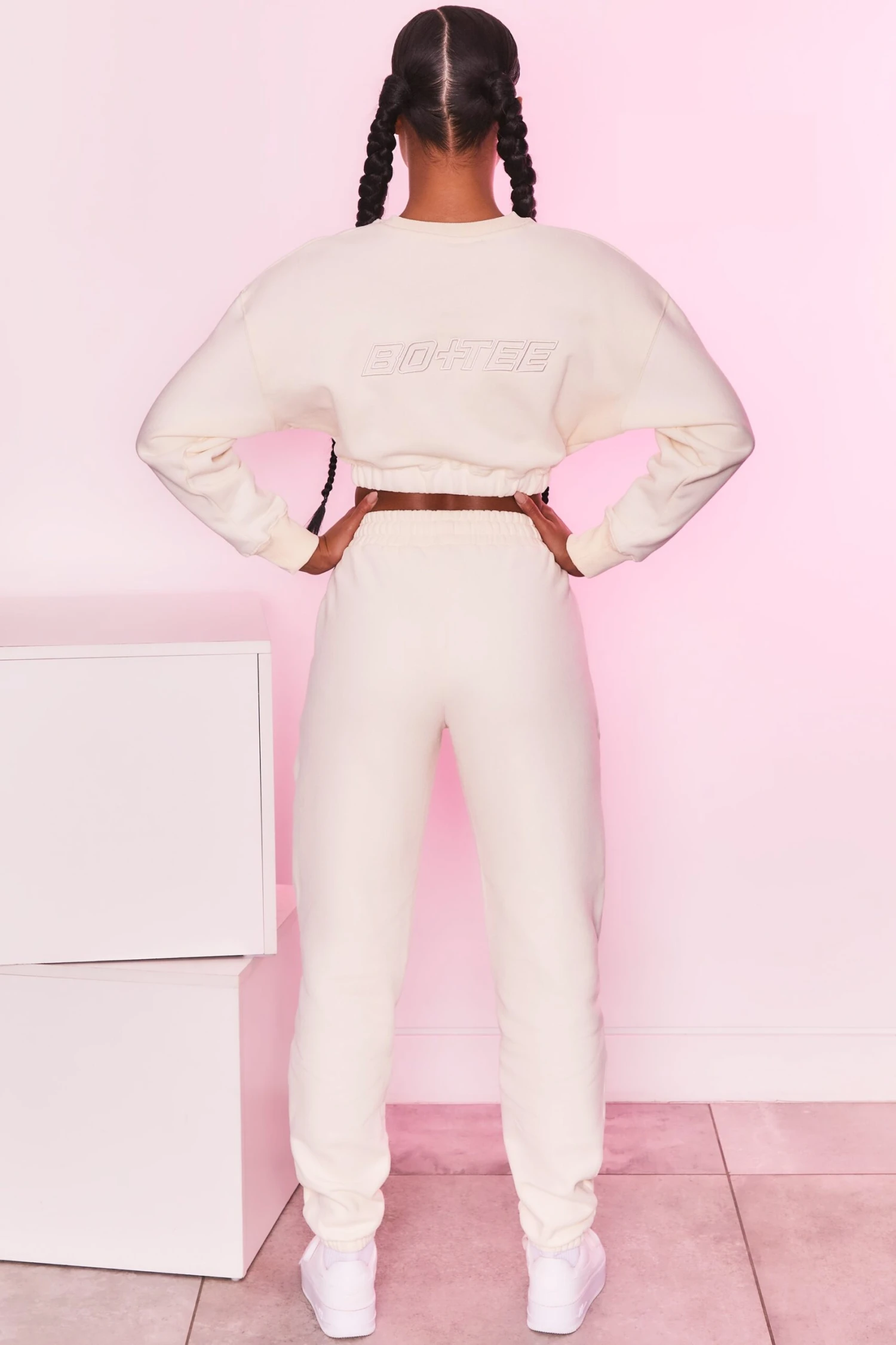 Super soft, comfy and relaxed, our all new sweatshirt is a must for keeping it casual on rest day. In cotton sweat fabric, its cut to a cropped length with elasticated hem, round neckline and long sleeves in a cool oversized fit. This ivory jumper is finished with statement stitched Bo+Tee branding on the back for a sporty edge. Pair with the matching joggers to complete the tracksuit set.