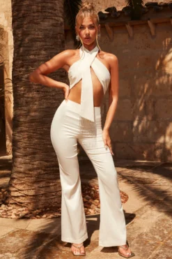 Believe us when we say, you’re going to look flawless in this one! Our wrap jumpsuit, designed in smooth satin fabric, features a halter-neck clasp fastening, cross over straps to cover your bust and draping tassel design with embellished fringing to add glamour to your look. Cut-out detailing leads from the sides to show off your figure while tailored flare trousers keep the rest of you covered. Pair with chic mules for a look that is ready for your next evening out with the girls.