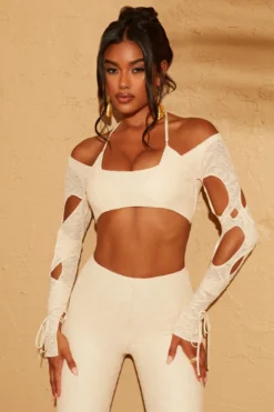 Need to update your vacay wardrobe? Say hello to Thar, the perfect holiday wardrobe crop top. This unique design features a supportive halter neck bralet overlaid with an off the shoulder, long sleeve distressed lace crop top. Statement cut outs descend along the overlapping, extra long sleeves and functional ties wrap around the forearm to the wrist for a delicate finishing touch.