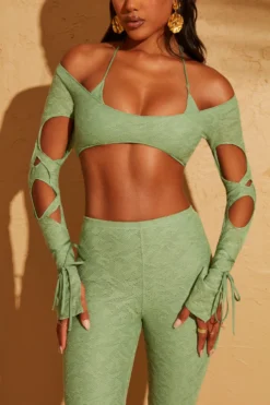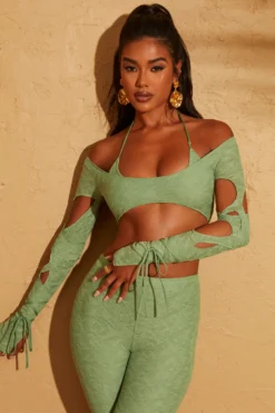 Need to update your vacay wardrobe? Say hello to Thar, the perfect holiday wardrobe crop top. This unique design features a supportive halter neck bralet overlaid with an off the shoulder, long sleeve distressed lace crop top. Statement cut outs descend along the overlapping, extra long sleeves and functional ties wrap around the forearm to the wrist for a delicate finishing touch.