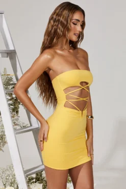 Bodycon, strapless and with statement cut out detailing, the Aurelia mini dress is perfect for your next vacation. Featuring a bandeau neckline, the Aurelia bodycon mini dress is designed to stand out with multiple criss-cross straps across the front and a dipped cut out at the skirt. Style with loose waves and your favourite sunglasses for a stand-out pool party look.