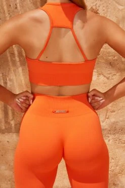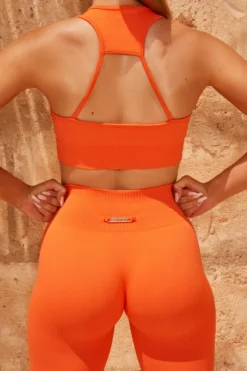 Get up to speed in our Accelerate sports bra. Designed in seamless slinky knit fabric to maximise movement whilst you train, this stylish sports bra features a thick ribbed underband for added support, scooped neckline and metal hardware branding. The back detailing will ensure you stand out in the gym with half racer shaping and straps that create the ultimate cut-out detail. Paired with matching shorts or leggings this sports bra in deep orange is sure to keep you on top.