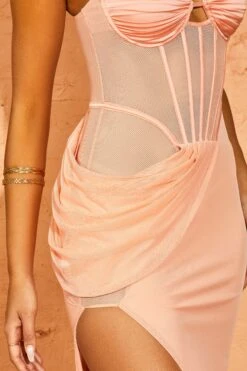 The Signia corset dress cinches your waist with its structured mesh bodice and underwired cups, made with ruching over the bust and spaghetti straps which are adjustable to get the perfect fit. The dress is complete with draping to one side and a high side split to make sure your legs go on for days.