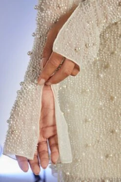 Fun and flirty, Soho was designed for girls who know how to command attention. Cut from our pearl and bead adorned fabric in two lustrous colourways, Soho features a bust flattering cowl neck with asymmetric, ultra thin straps that cascade across the neckline. With our signature built-in corsetry that works to cinch your waist, Soho is a bodycon design to the waist before the skirt falls to a thigh skimming a-line design. Complete with fully embellished, detached long sleeves that flare at the wrist, Soho has everything you need for your new season, party girl wardrobe.Â