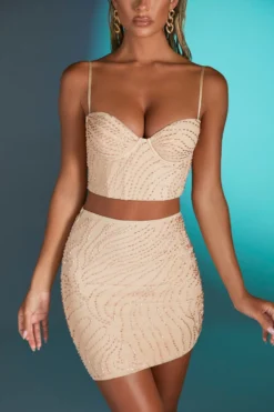 Sitting high on the waist with a leg lengthening asymmetrical hemline and all-over embellished design, Martinique mini skirt was made for glittering under the stars this season. Style yours simply with our matching corset crop top and tie-up heels for a stand out look this season.