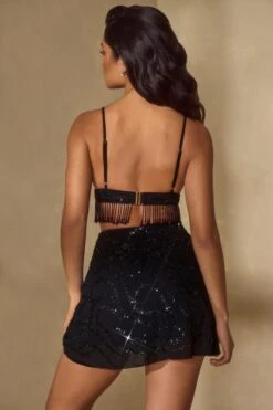 Delicate embellishment and beaded tassels give this classic bralet shape a vintage inspired twist. The ultimate party piece, the Vaira bralet is cut from our premium georgette fabric and embellished with pretty beading that sparkles under dance floor spotlights. The classic triangle shape is both bust flattering and sexy with beading fringing that cascades against your exposed waist. Ensuring the wearer exudes a playful confidence wherever the evening leads you, the Vaira bralet is a partywear essential.Â