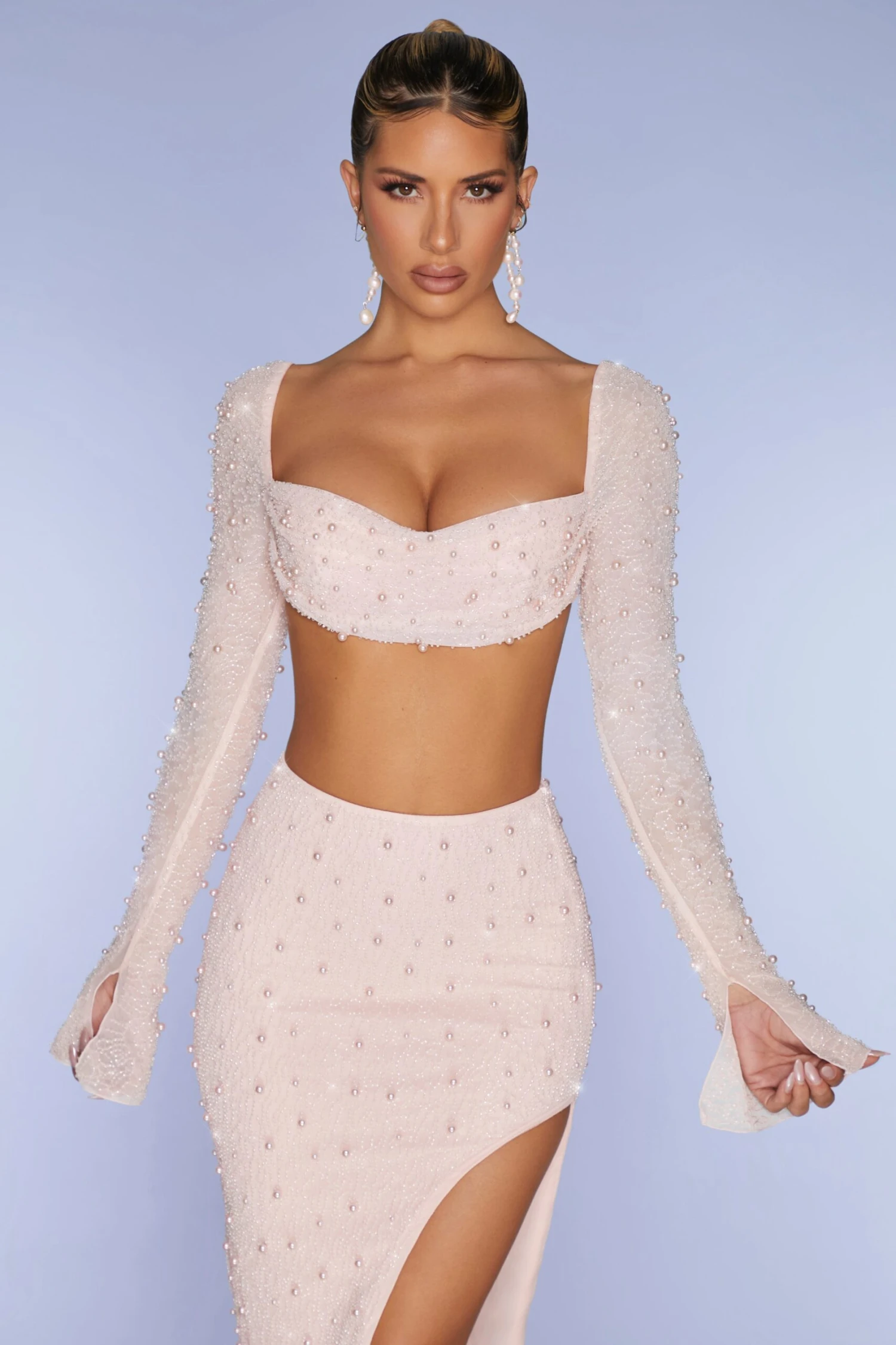 Designed to make an impact, La Desirade is super cropped and super embellished. Fully beaded with extra long mesh sleeves that flare at the wrist, the La Desirade crop top features an underwired bust with a pearl embellished, cowl neck overlay. It’s time to feel adorned in our embellished mesh crop top.
