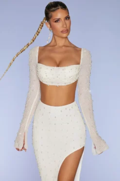 Designed to make an impact, La Desirade is super cropped and super embellished. Fully beaded with extra long mesh sleeves that flare at the wrist, the La Desirade crop top features an underwired bust with a pearl embellished, cowl neck overlay. It’s time to feel adorned in our embellished mesh crop top.