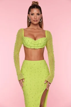 Designed to make an impact, La Desirade is super cropped and super embellished. Fully beaded with extra long mesh sleeves that flare at the wrist, the La Desirade crop top features an underwired bust with a pearl embellished, cowl neck overlay. It’s time to feel adorned in our embellished mesh crop top.