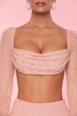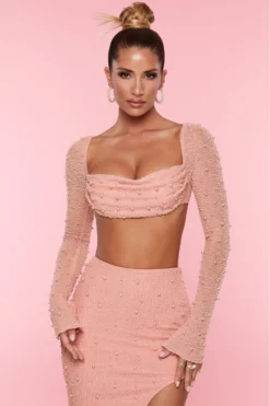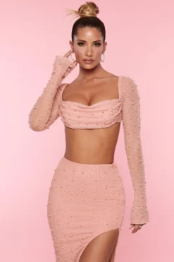 Designed to make an impact, La Desirade is super cropped and super embellished. Fully beaded with extra long mesh sleeves that flare at the wrist, the La Desirade crop top features an underwired bust with a pearl embellished, cowl neck overlay. It’s time to feel adorned in our embellished mesh crop top.