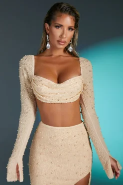 With long flared sleeves and a bust-flattering draped cowl neckline, this ultra-cropped top is the elevated staple you need for upcoming events this season. Designed in super soft mesh fabric with delicate pearl adornment, La Désirade is the perfect combination of high fashion styling and signature Oh Polly glamour. Compliment this cropped top by styling with our embellished thigh split maxi skirt or mesh mini skirt for a high impact, high fashion event look.
