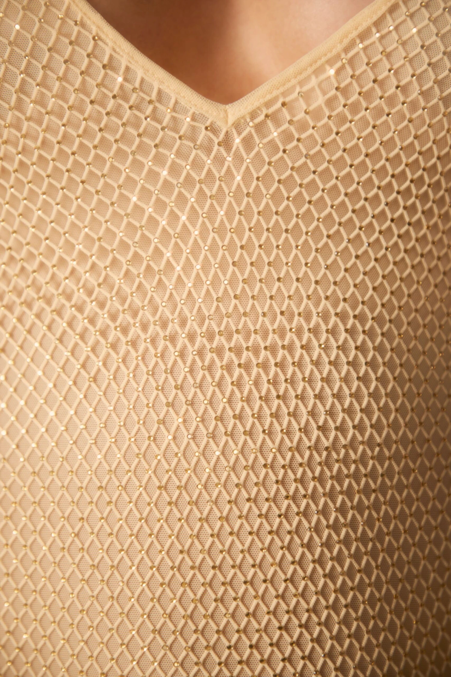 A sexy silhouette cut from our all new stretch mesh and embellished fishnet fabrication, the Lyric maxi dress is a fun and seductive style, perfect for the upcoming festival season. Fully adorned with sparkling rhinestones throughout, this semi sheer maxi dress is tight cut to the body for a seductive, curve accentuating fit that stands out amongst the crowd. With a plunging V neckline and seductive low back, the Lyric maxi dress is complete with a sexy thigh high split that exposes the left thigh.Â