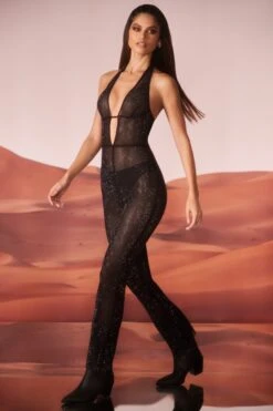 A vintage inspired jumpsuit given a sexy modern edge, the Ramona full length jumpsuit is a staple festival style you’ll love year after year. Cut from our all new stretch mesh and embellished fishnet fabrication, the Ramona jumpsuit is a seductive style with a bust flattering plunge neckline with halter neck fastening. Fully adorned with sparkling rhinestones throughout, this semi sheer jumpsuit is tight cut to the knee before falling to throwback inspired flared hem.Â