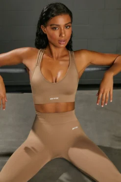 Its time to get that motivation back in our new seamless sports bra. Styled with a plunging neckline and asymmetric crossover back with multi strap detailing, Emerge brown sports bra is designed in our seamless slinky fabric to maximise movement. The supportive underband and tight cut fit works to flatter your bust whilst keeping you in place. Pair this cross strap sports bra with the matching shorts for a sleek gym look that will push you further.