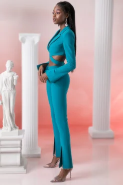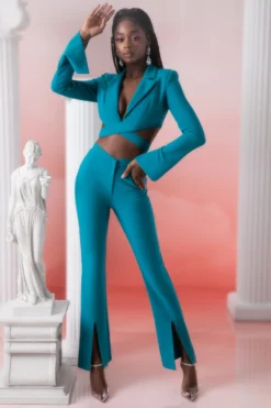 Cut to an angled high waisted fit in our stretch suiting fabric, our Jacinta trousers are designed to flatter. Tight cut to the body but falling to a gentle flare hem that splits from the mid-calf, our Jacinta full length trousers are the perfect separates for elevating a day or evening look.Complete the look with the coordinating cropped blazer for a cohesive tailored look.