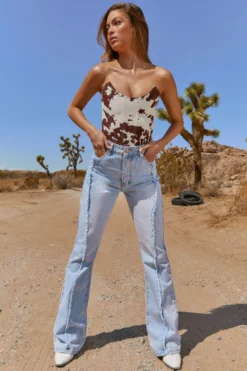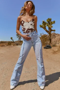 Throwin’ it back, our light wash denim jeans are cut in a classic flared leg fit with a super high waist to cinch you in. Featuring vintage frayed seam stylin’ on the front and rear, we’re pairing these retro denims with a white cropped tee and chunky trainers. Super cute!