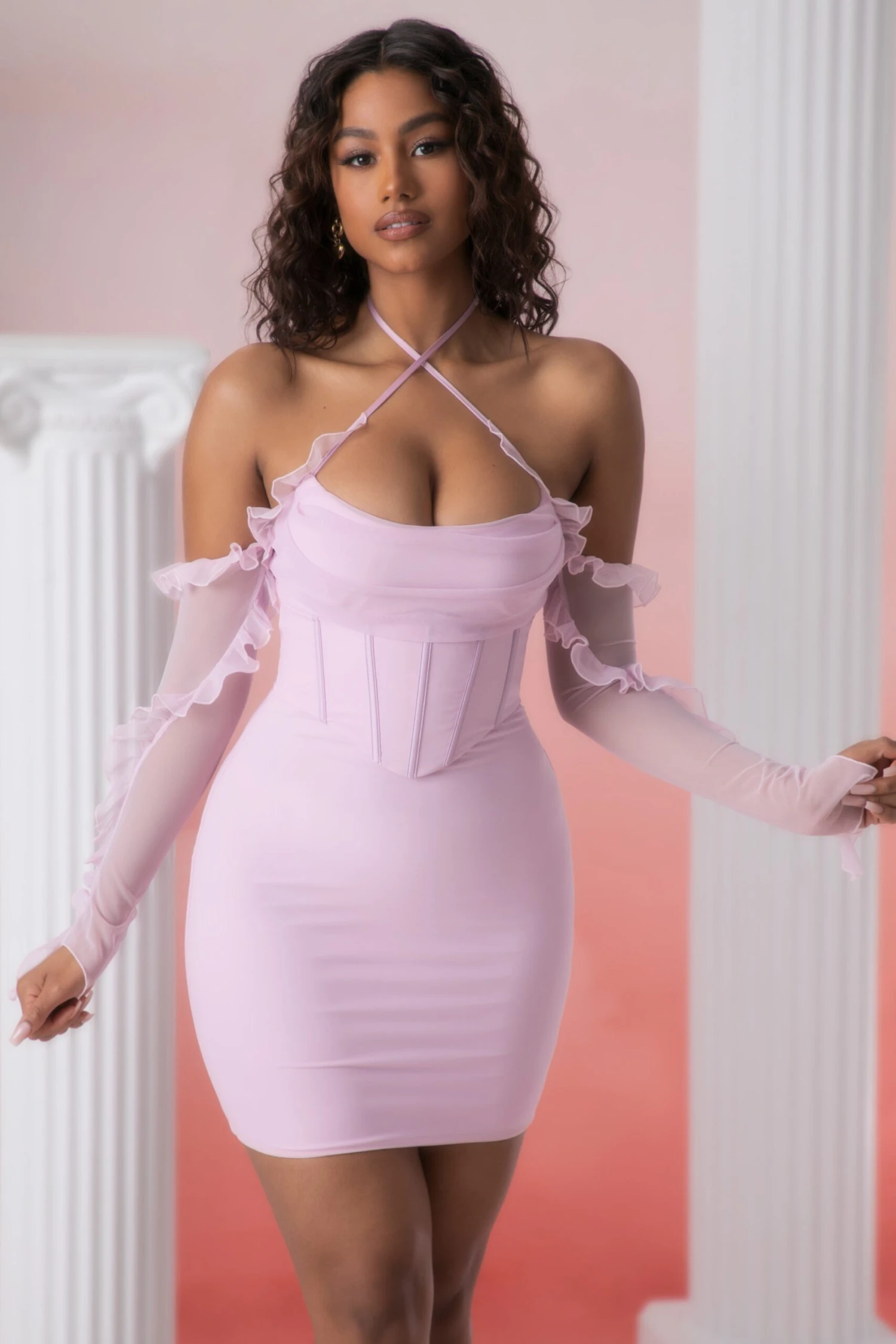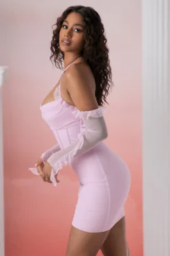 Designed in our soft jersey fabric with a luxurious mesh overlay, our long sleeve mini dress features cascading frills and bardot sleeves for a truly romantic look. Complete with inbuilt corset boning and underwired cups that provide support and structure, Makaria features a subtle cowl neckline with a halterneck strap that flatters your bust.With so many stand out features our long sleeve mini dress requires only minimalistic accessories.