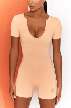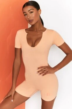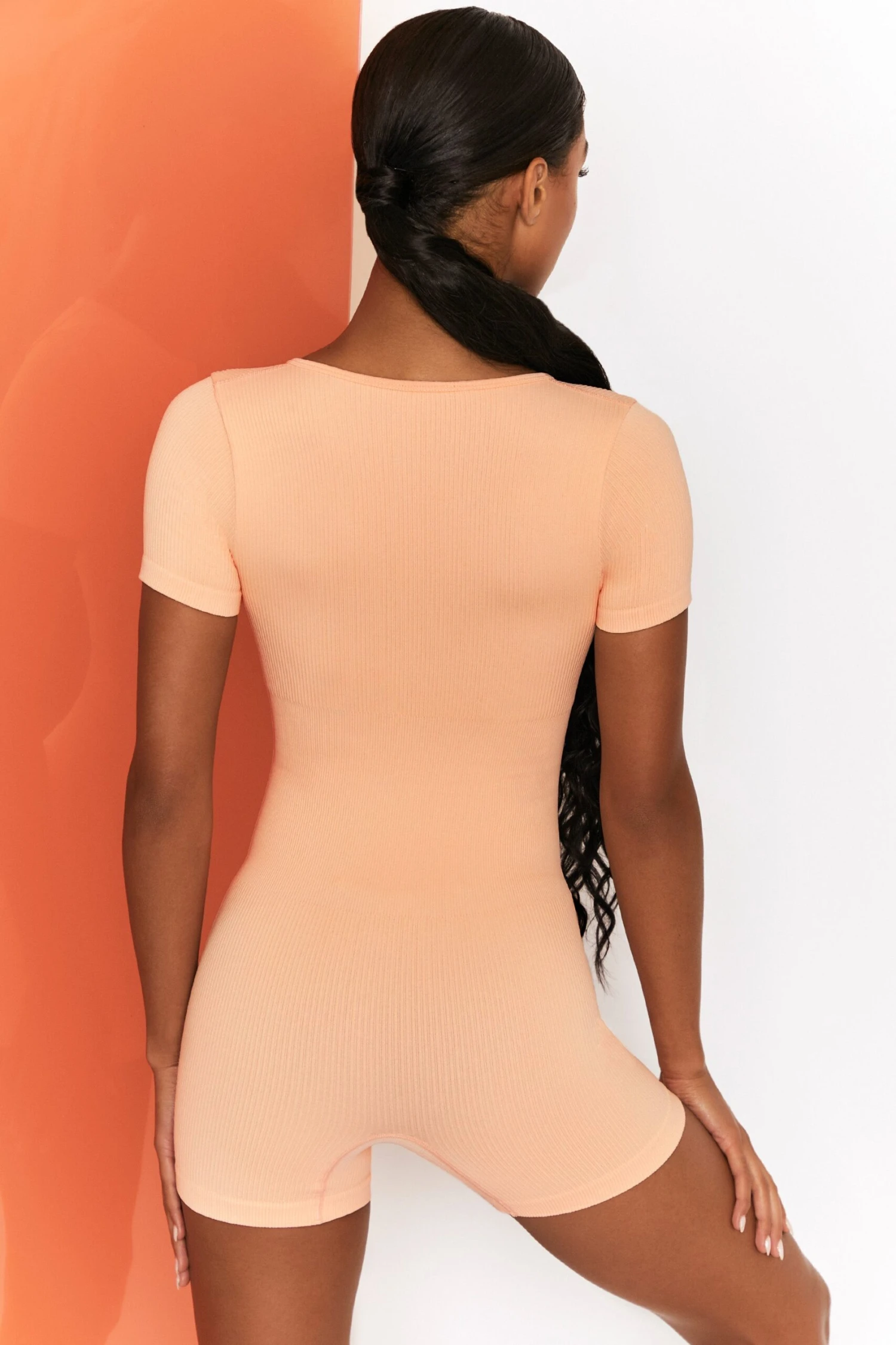 WhatÂ’s your game plan? This pull-on unitard is designed in our seamless knit fabric with an all over ribbed finish to sculpt your shape. Fitting tight to the body but with a comfortable stretch feel, this short playsuit features short sleeves and a plunge, notch neckline. Soft, comfy and stylish with a simple design, workout looks have never been easier.