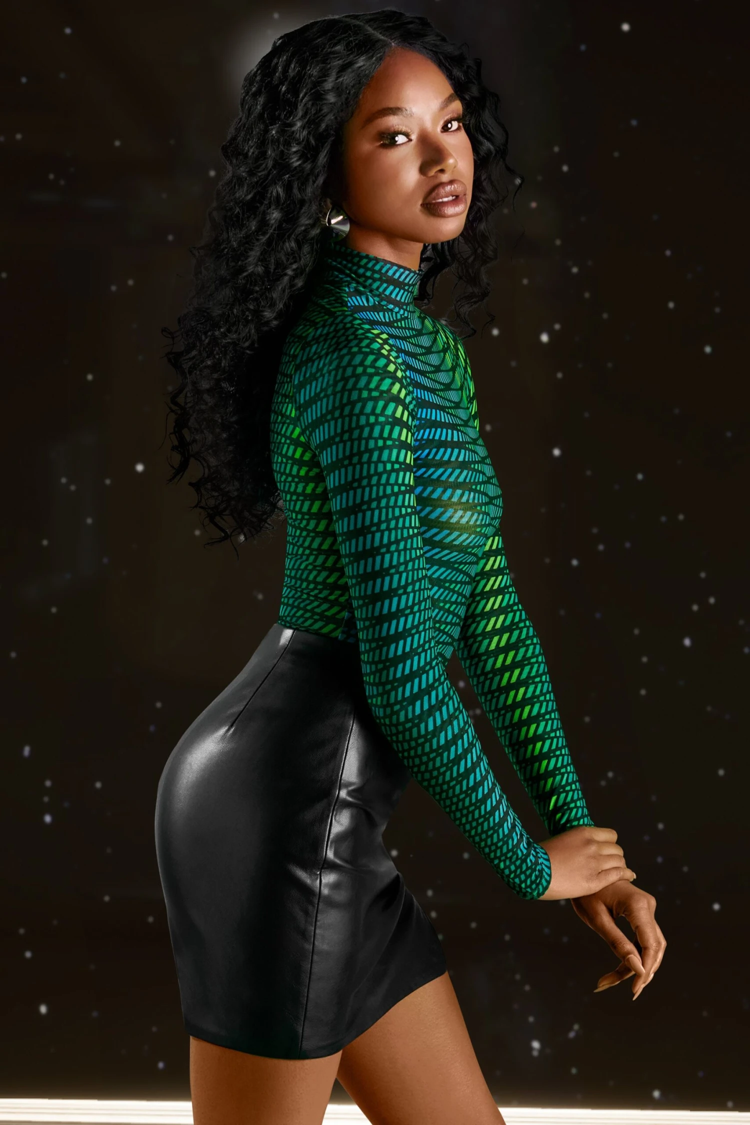 We’ve figured out the perfect bodycon fit in our high neck bodysuit. Designed in our intergalactic double mesh fabric you’ll be supported for any adventure. We’re pairing this statement all-in-one with our Aura mini skirt for the journey.