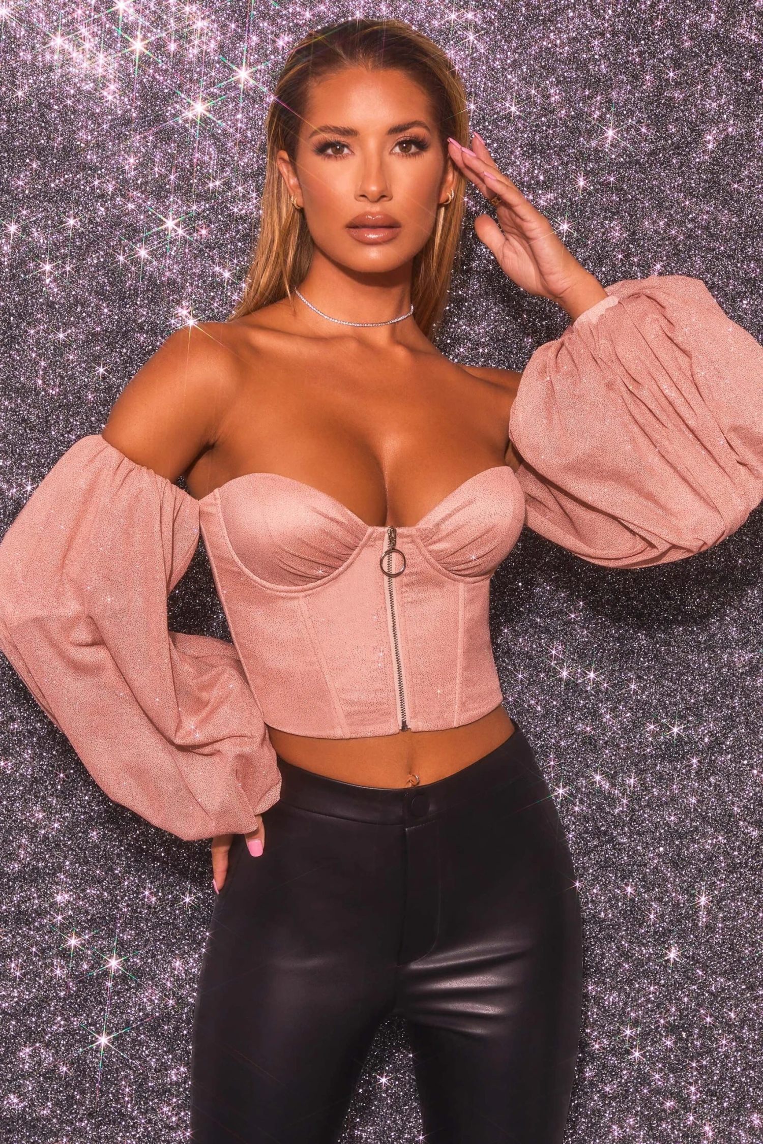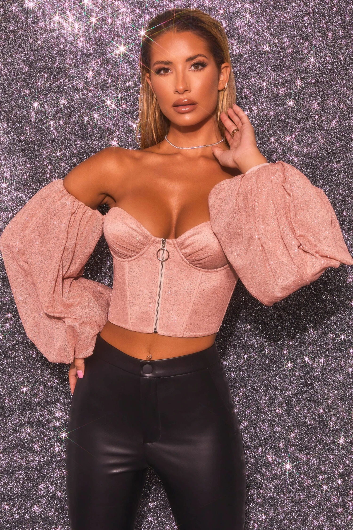 Keep On Shining Bardot Puff Sleeve Crop Top In Rose Gold - Image 4