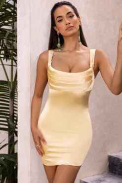 It’s not a mirage we’re seeing, it’s you babe – in our new cowl neck mini dress! Knotted strap detailing adds a touch of elegance to the cowl style neckline, framing your features with it’s gathered bust. Our luxe satin fabric hugs your figure in the classic bodycon fit. Pair with strappy sandals for a look that they can’t resist!