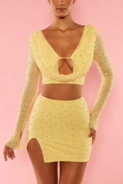 It’s co-ord season and the Villefranche crop top is a partywear essential for a co-ord look that will undoubtedly stand out. Designed in our premium embellished mesh fabric with super soft jersey underlay for a comfortable, dual layered fit, Villefranche features a deep cowl neckline adjoined by a delicate beaded strap for added allure. All about the elevated details, this super flattering design features single layer, beaded mesh sleeves that feature split flare detailing for an undeniably elevated evening look.