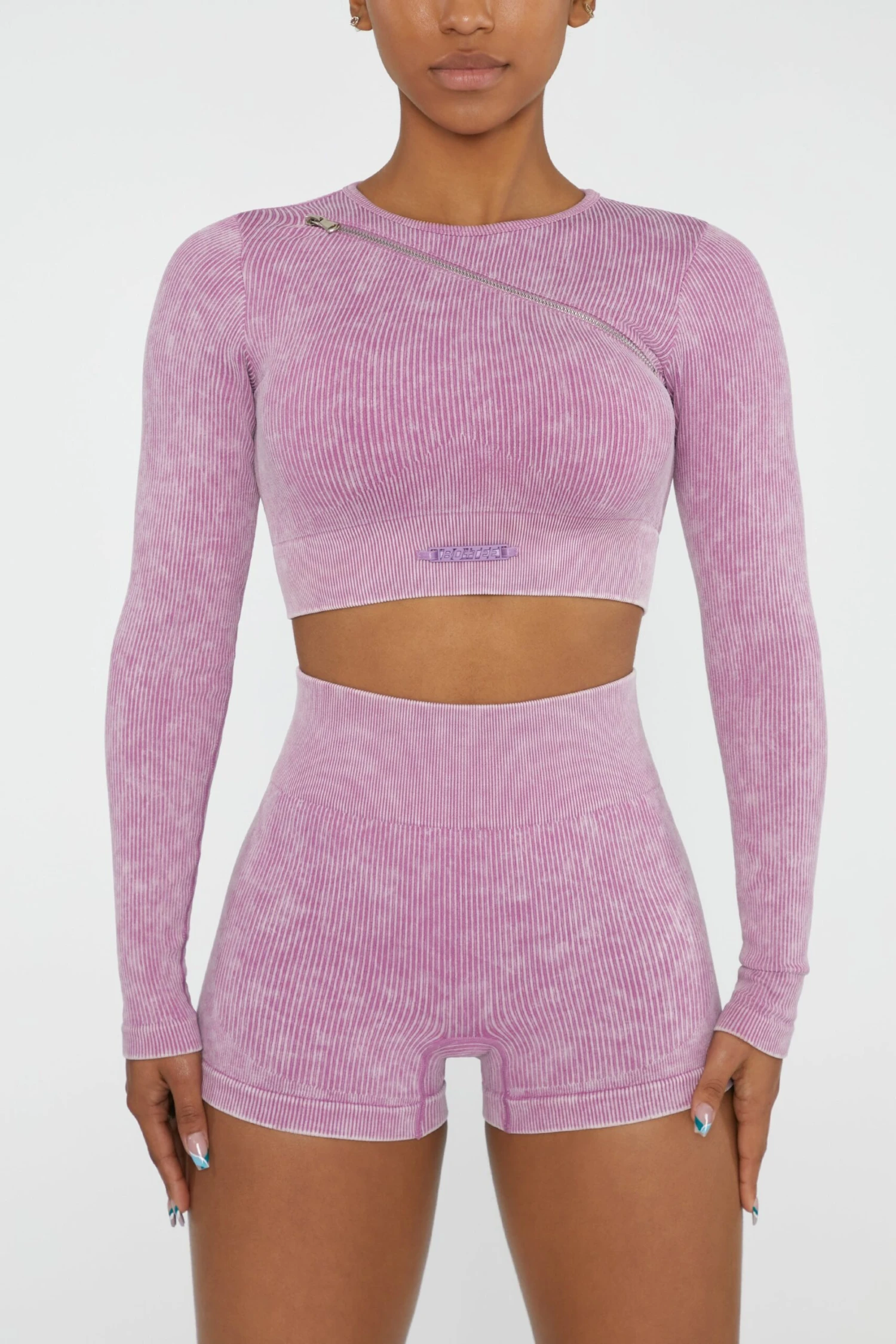 Motivation starts with a new kit, and you can trust Agile to get you in the mood. You’ll love the fit, made in seamless, sweat-wicking fabric with an acid wash design. Long sleeves, a cropped length and diagonal zip detail finish the look. Pairs well with the matching leggings or shorts.