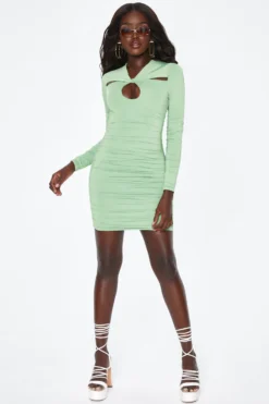 Obsessed with this dress? Made for dinner, drinks and dancing, this mini dress has a keyhole bust, twisted neck detail and curve-loving ruching to the body and sleeves. Start your night right and team with lace up strappy heels.