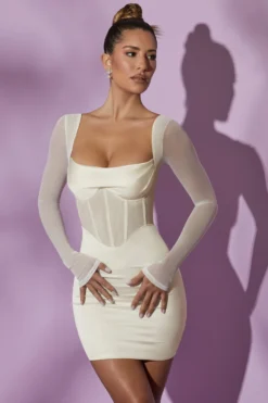 Fall in love forever in our Lorient satin mini dress. Designed in our luxuriously soft, stretch satin fabric and cut to a figure-hugging fit with cowl neckline, Lorient works to flatter your shape and enhance your assets. Complete with extra long mesh sleeves and mesh boned corset detailing that cinches your waist, you can rely on the Lorient mini to create a glamorous party look.