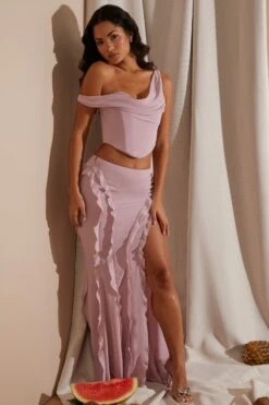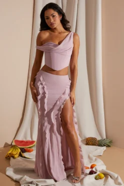 A romantic and elegant separate piece designed to elevate your evening wardrobe, the Lucia maxi skirt is a perfect hybrid of sophisticated and sensual. With a mid rise waistband, the Lucia maxi skirt is cut from our premium georgette fabric that hugs the hips for a curve enhancing fit before falling into a flattering fishtail silhouette. Fully adorned with ruffle detailing that creates a dramatic overall look, the Lucia maxi skirt is complete with a seductive high split that elongates the legs.