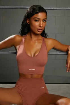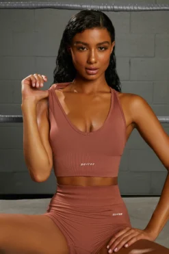 Grow your confidence in Overhaul seamless crop top, featuring a plunging halter neckline and racer back design with knot detailing. Designed in smooth, slinky seamless fabric for a supportive bust flatter fit, this rust gym top is a stylish upgrade to your workout wardrobe. Pair with the matching gym shorts and look amazing from every angle.