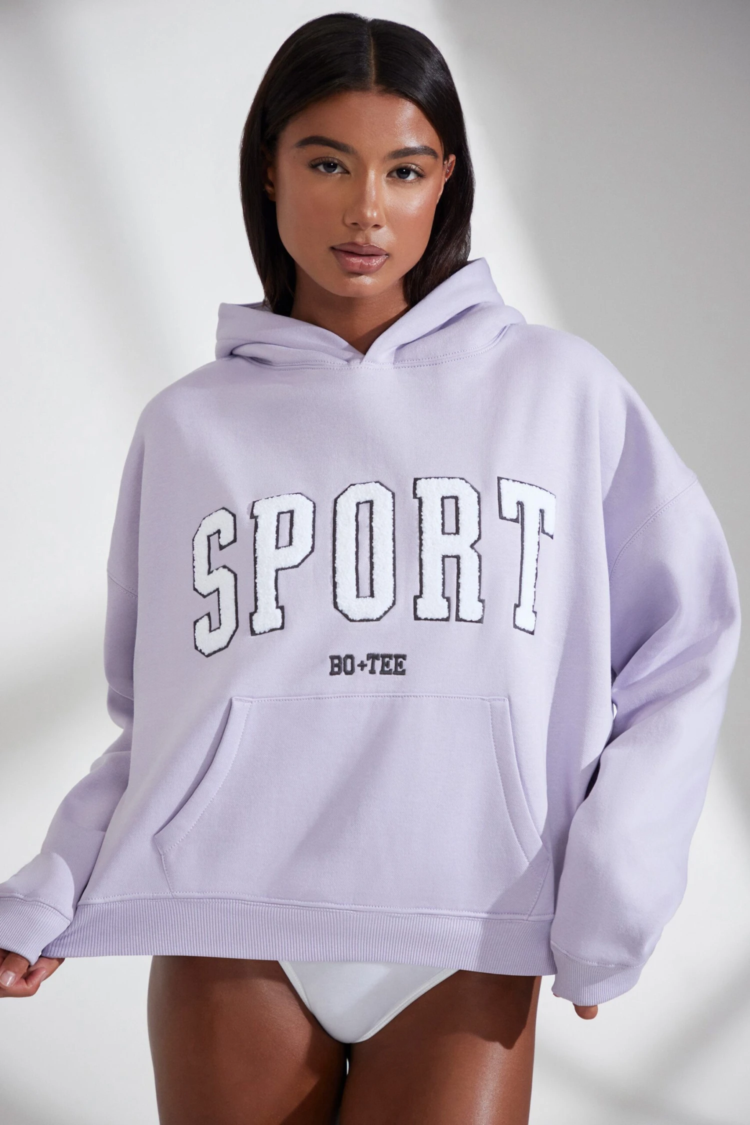 Say hello to your new favorite, oversized hoodie. Cut from our 330gsm heavyweight custom knit fabric, the Varsity oversized hoodie is fleeced on the inside for a super soft and cozy feel. Designed for ultimate comfort, the Varsity hoodie has a relaxed fit with dropped shoulders, oversized sleeves and kangaroo pockets and is complete with a signature Bo+Tee Sport applique patch varsity logo.Â