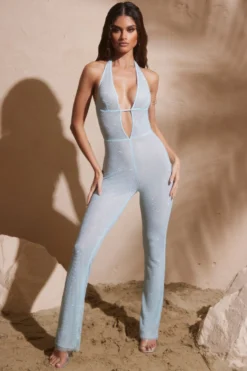 A vintage inspired jumpsuit given a sexy modern edge, the Ramona full length jumpsuit is a staple festival style you’ll love year after year. Cut from our all new stretch mesh and embellished fishnet fabrication, the Ramona jumpsuit is a seductive style with a bust flattering plunge neckline with halter neck fastening. Fully adorned with sparkling rhinestones throughout, this semi sheer jumpsuit is tight cut to the knee before falling to throwback inspired flared hem.