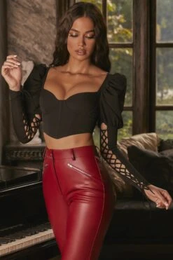 Love moves in mysterious ways, but it’s no mystery we’re obsessed with our new long sleeve crop top. In premium crepe fabric with long puff shoulder sleeves that feature inner cut-out, lace up detailing, our puff sleeve crop top is finished with a bust-flattering sweetheart neckline and subtle V shaped hem to frame your shape. We’re so ready for our next night out in this one, babe.