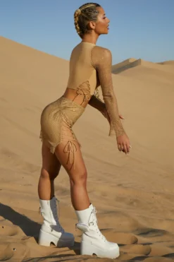 Introducing The Mesa, a micro mini skirt with an asymmetric hem and lace up detail to one side. The layered mesh fabric is embellished all-over with sparkly rhinestones. Style it up with the El Mirador top, western boots and loose waves for a headlining look.