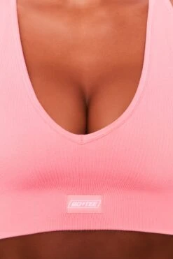 Be the best you can be in our supportive, plunge neck sports bra. Designed in our seamless knit fabric with a ribbed underband for a stay-put fit, this flattering crop top features a racer back to frame your shape. Providing freedom of movement throughout your workout, weÂ’re pairing with the matching ribbed leggings for a colourful, motivating gym set this season.