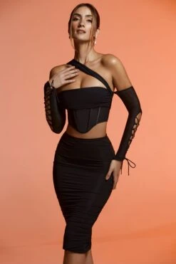 A wardrobe staple crafted from our premium dual layered, mesh fabric, Jarida is a must have separate piece. Sitting high on the waist and falling to a midi length, this stretchy midi skirt is the perfect combination of comfort and elegant styling. With a narrow slit on the reverse that allows for ease of movement, Jarida is the perfect transitional piece to transform your wardrobe.