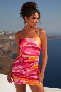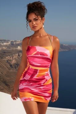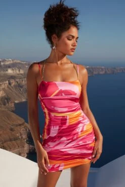 We’re getting a one way ticket this summer in our satin mini dress, babe! Full-body ruching, designed in luxe satin fabric works to flatter your figure and hug your curves. Featuring thin adjustable straps and a straight neckline this pink printed mini dress is finished off with trending chain detailing. We’re pairing this satin look with heeled mules and a baguette bag for a cute summer ‘fit.