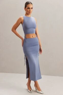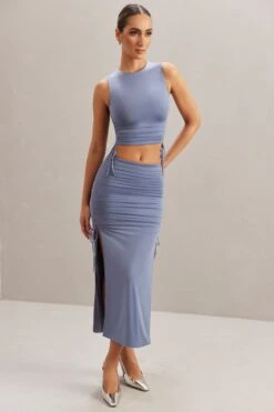 Designed in our premium, slinky jersey fabric, the Bahiya tank top is an essential style for creating a cool girl aesthetic. Cut to a cropped length with a high round neckline, this sleeveless tank has waist cinching ruching and delicate fastenings at both sides. A minimalistic staple that can be dressed up or down depending on where the day takes you, we know you’ll love this wear anywhere tank top.Â