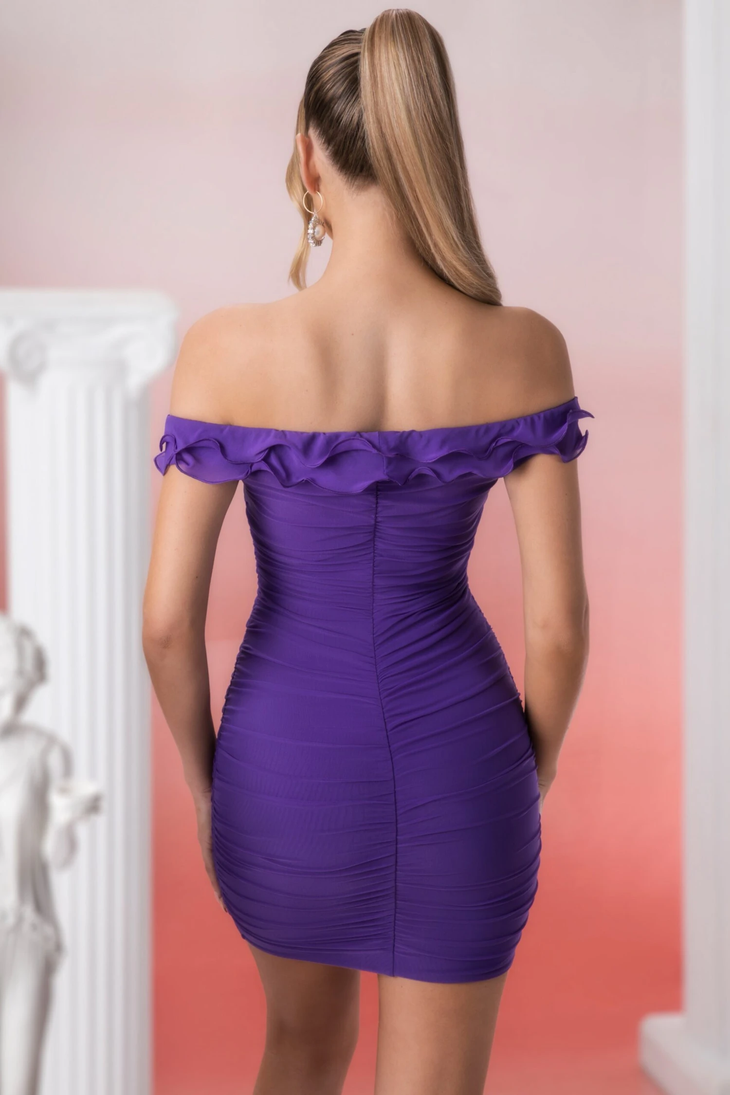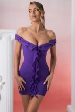 Fall in love with our all-new ruffle detail mini dress, Philia. It’s made in our figure enhancing, ruched fabric with ruffles across the shoulders and centre front. Complete with a shoulder exposing bardot neckline, this dress was designed to stand out. Style with our “Promise Me” heeled mules and statement earrings.