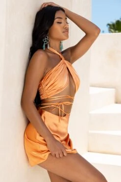 Show off your stunning summer glow in our Glow With Me crop top! Gathered satin fabric covers your bust, with knotted halter neck detailing and a tie back fastening. Ultra-thin straps wrap around your waistline and allow you to tie in a variety of ways – we love the crossover look! Showing a ‘lil bit of skin has never looked so good, babe!